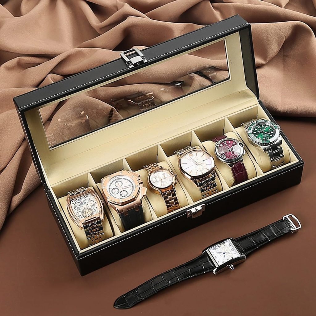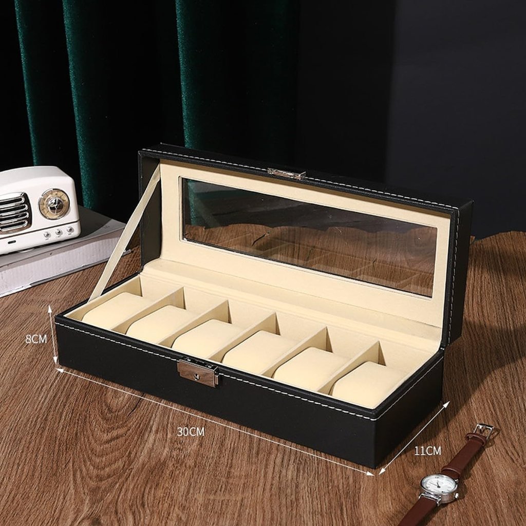 - ? 6 SLOT WATCH STORAGE BOX : Designed to neatly store and organize up to six watches, keeping them safe, dust-free, and well-arranged in one elegant case.