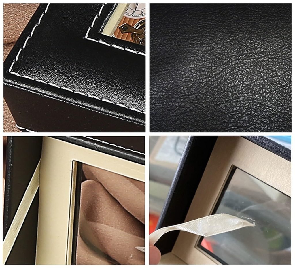 Material Characteristics: The watch storage organizer box is made of high grade faux leather and top gives a clear view when the box is closed. and it has a metal clip lock.