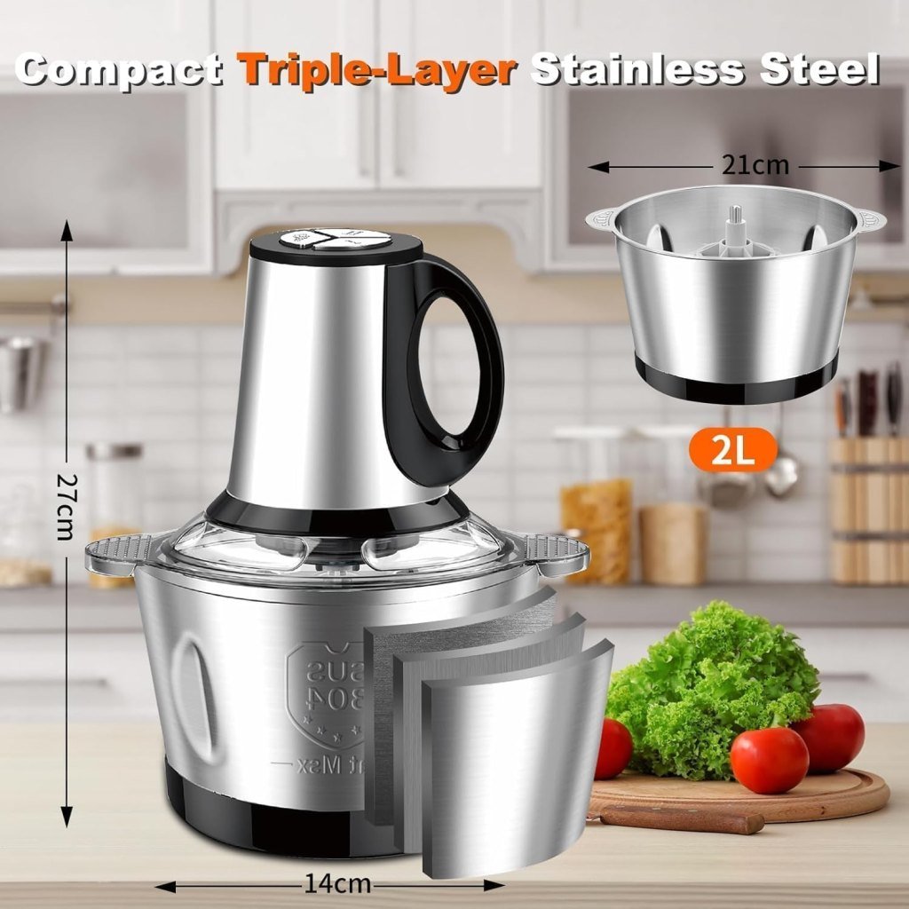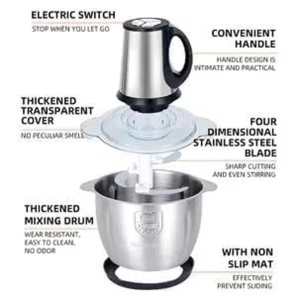 Title: Meat Grinder 2 Liter with Handle - Stainless Steel Electric Meat Grinder Machine with Bowl for Kitchen - Heavy Duty Food Chopper, Vegetable and Fruit Mixer, Juicer, Home Use