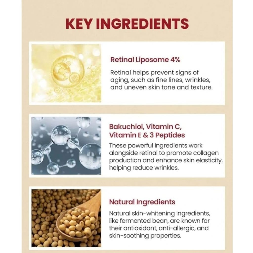 Retinal Liposome 4%, Soybean Ferment, Bakuchiol, Vitamin E, Peptides. Soybean Ferment. Bakuchiol. Vitamin E. Peptides