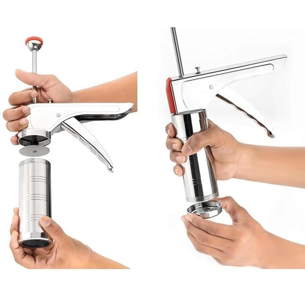Multi-purpose kitchen press for making idiyappam, murukku, chakli, sev, noodles, gathiya, bhujiya, cookies, farsan, and various namkeen snacks with ease